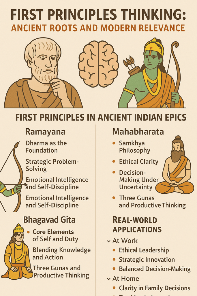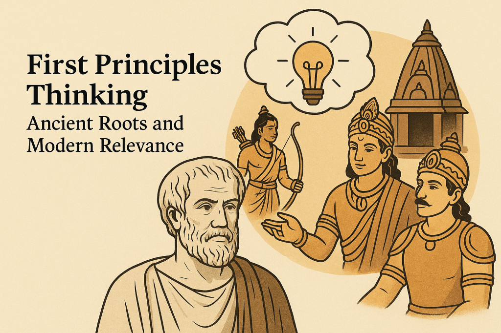 First principles thinking—breaking down complex problems to their most basic truths and reasoning up from there—is often attributed to Aristotle. However, this approach is deeply embedded in ancient Indian wisdom, as reflected in the Ramayana, Mahabharata, and Bhagavad Gita. These epics offer profound examples of fundamental reasoning, ethical clarity, and strategic problem-solving that align closely with first principles thinking.