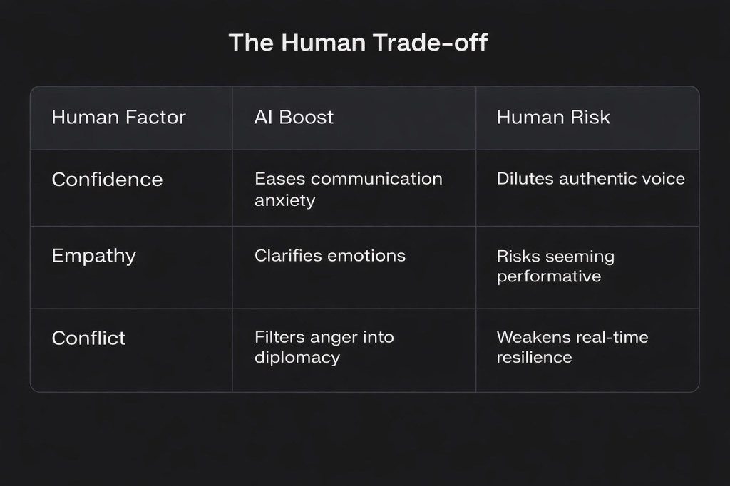 Communication is a muscle. By relying on AI to navigate difficult conversations or craft apologies, we risk a decline in “human grit.” There is a growing concern that we are losing the ability to handle conflict in real life, face-to-face, without a digital mediator to soften the blow.